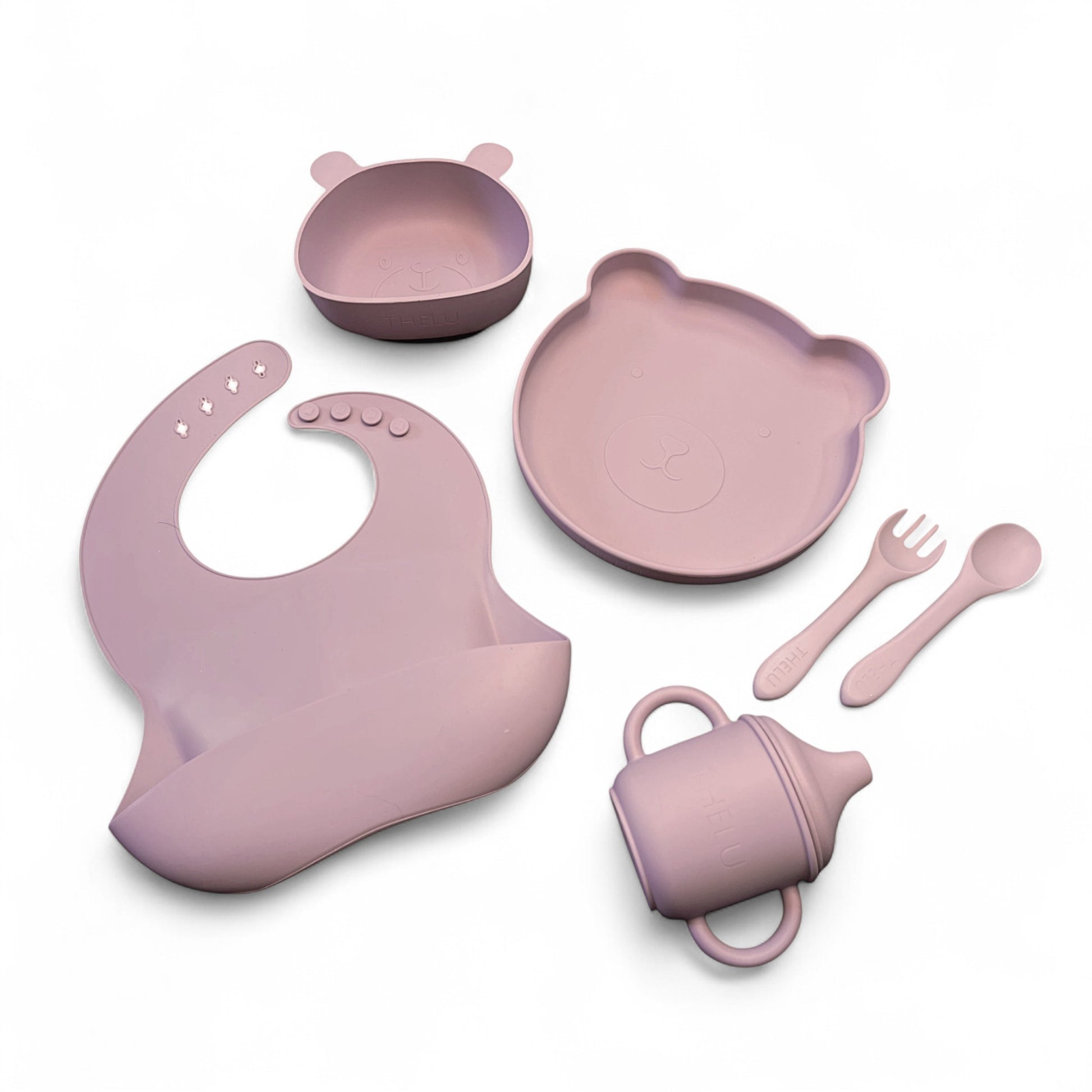 やわらかくて安全なシリコーン素材で作られた「ごくま6点セット」は、離乳食期から使えるベビー食器セット。くまモチーフのプレートとボウル、シンプルで持ちやすいカトラリー、飲みやすいトレーニングカップに加え、食べこぼしをキャッチするビブも揃っており、はじめての食事タイムにぴったりなアイテムです。