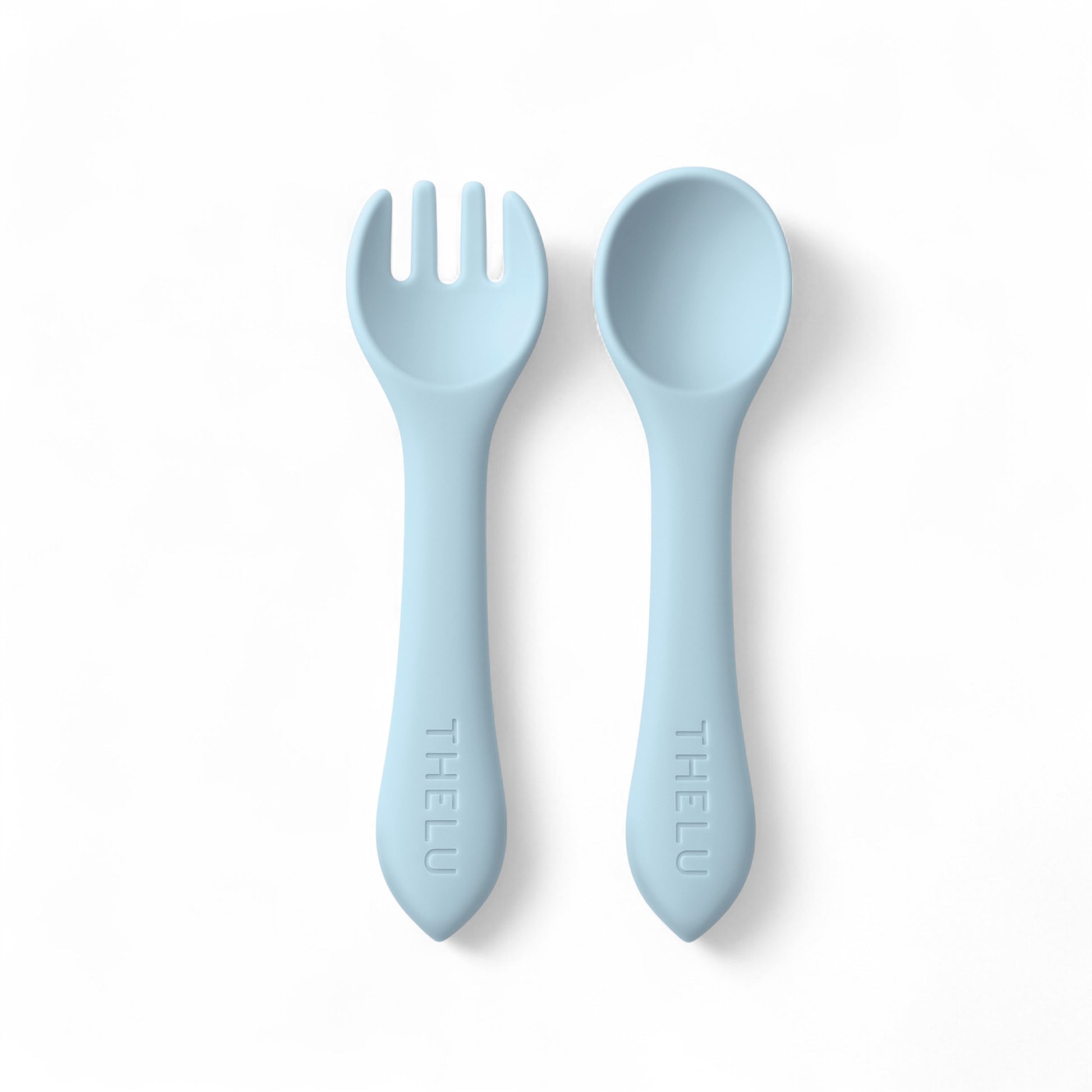 フォークとスプーンの2本がセットになった、まるごとシリコーン製のカトラリー。やわらかく安全な素材で、はじめての「ぱくぱく」にぴったり。持ち手には、さりげなくブランドロゴ「THELU」が刻まれています。