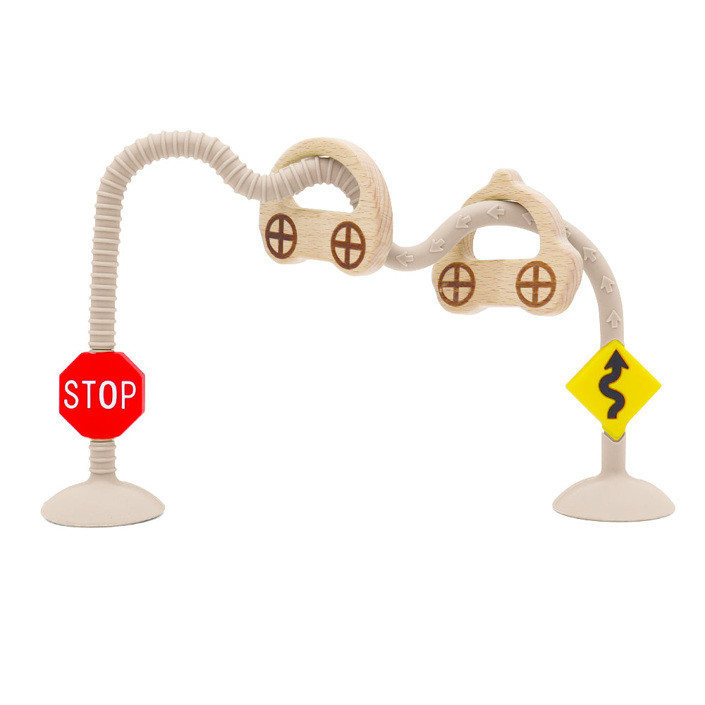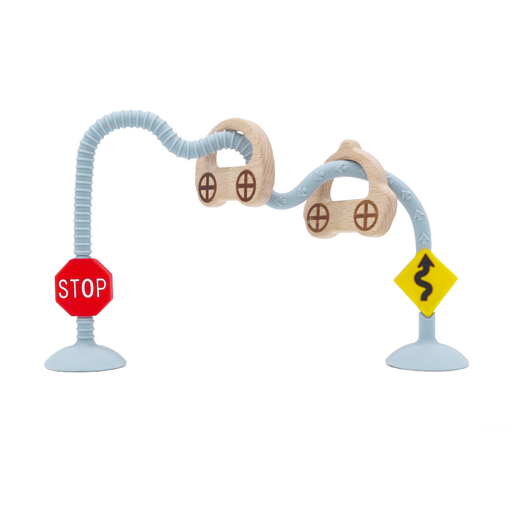 柔らかいシリコン道路は自在に曲げたりねじったりでき、裏面の吸盤でテーブルや床にぴたっと固定。子どもの発想力次第で何通りにも道を作れます。