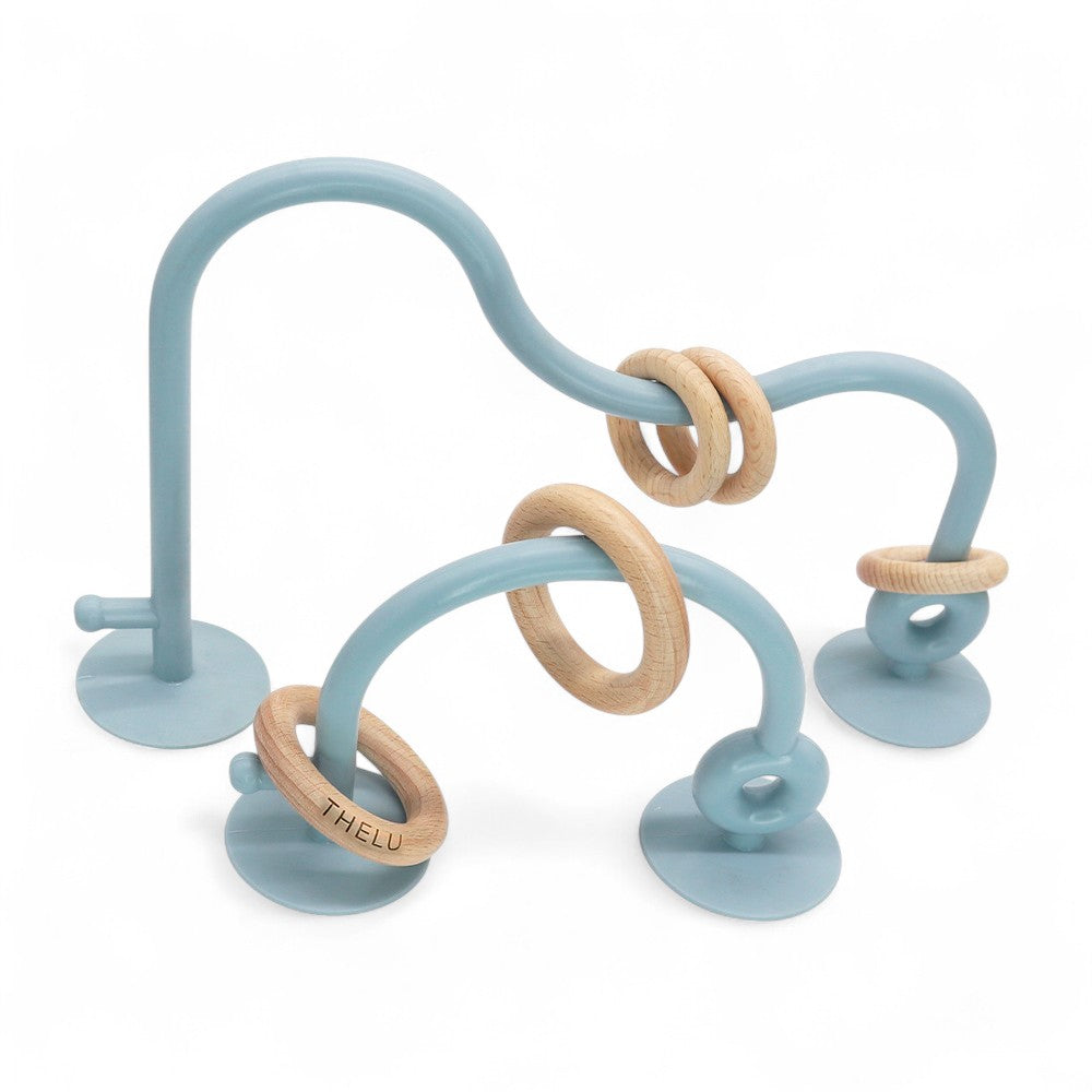 『輪のロード』は、カラフルで柔らかいシリコンアーチと、やさしい手触りの天然木リングがセットになった、新しいスタイルの知育おもちゃです。